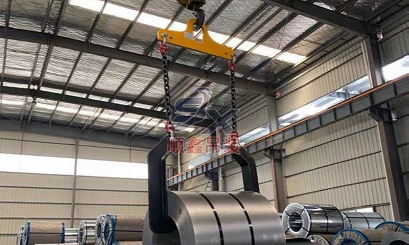 翻轉吊具通過機械剪力原理,對立式擺放的卷鋼進行單邊抓取,來完成卷鋼的裝卸,當改變重力點時,可以對卷鋼進行翻轉,作業時不傷鋼卷。其吊耳采用加厚處理,焊縫飽滿牢固、延長使用壽命。